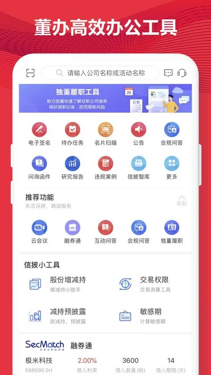 易董是一款超棒的商务助手应用!它能帮你轻松管理日常事务。日程安排、任务分配、时间提醒都不在话下,还支持多人协作,团队成员能互相分享和同步日程,工作效率大大提高。它有董事会、监事会、股东大会相关功能,公司三会情况即时可看。任务管理、会议管理、审批管理清晰明了,PC 端和移动端完美交互,沟通协作超方便。能随时查询交易合规状态,证券市场法规在移动设备上也能随时查看。有电子签名、待办任务、名片扫描等功能,提供一站式董办高效办公工具,让你安全高效合规地管理董事会,轻松搞定公司事务与个人活动的待办管理,是企业和个人用户的得力管理帮手。