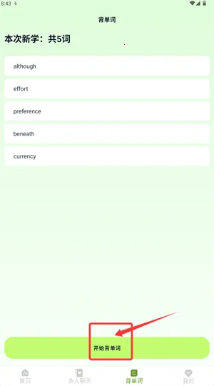 1、进入单词学习页面,查看当日新词列表并点击开始背诵功能键。