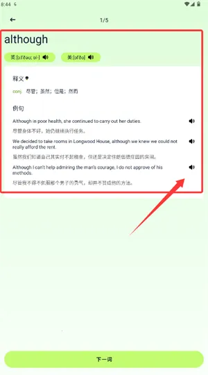 3、选择后将显示完整释义与例句,可点击扬声器图标重复收听发音。