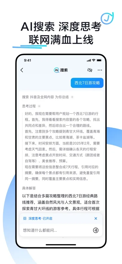 抖音搜索是一款超实用的搜索应用。它能解决你在各种场景下的搜索需求,比如找美食、学知识、了解时尚潮流等。这里内容超丰富,结合了抖音海量的短视频和图文,不管啥领域的信息都能找到。搜索精准又高效,先进算法能快速呈现你想要的。还会根据你的搜索历史和兴趣,个性化推荐相关内容。有强大的AI回答,能快速答疑解惑;搜索结果来自真实分享,靠谱又实用。操作也方便,在首页搜索框输入关键词就能搜,支持语音搜索,效率超高。而且能多维度过滤,精准定位范围。要是想清除搜索记录,打开抖音搜索App,点击搜索栏,下面有删除按钮,点全部删除选项就能清除。总之,抖音搜索能满足你多样的搜索需求,带来便捷又优质的搜索体验。