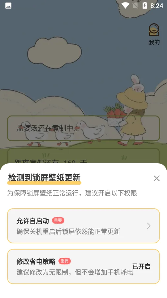 布丁锁屏是一款超棒的手机锁屏工具。它有海量绝美壁纸资源,涵盖少女心、卡通风、甜美系等各种风格,全都免费使用,能满足不同人的审美需求。其特色的萌趣小刘海设计,让锁屏更个性。软件功能丰富,可将倒数日、待办事项记录在锁屏上,不会忘事;还能把中高考四六级考研单词和真题显示在锁屏,每次解锁都能学习;每日课表展示在锁屏,抬手就能查看课程安排。另外,有个性便签、每日一言等功能,可写下碎碎念、座右铭,每天来点励志鸡汤或现实毒鸡汤激励自己。它的组件设置很有趣,每个组件都能自由编辑样式、字体、颜色等,轻松打造专属锁屏。设置步骤简单,进入软件挑选壁纸或DIY,上传图片,配置组件,选好后设为锁屏即可。而且能随时更新,还能记录重要日子,安排待办事项,美观又实用,快来下载定制你的专属锁屏吧!