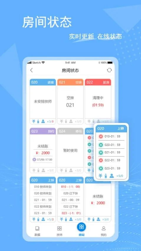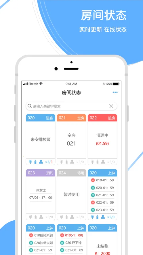 3. 房间状态实时显示,各房间使用情况一目了然,方便协调资源与安排服务。