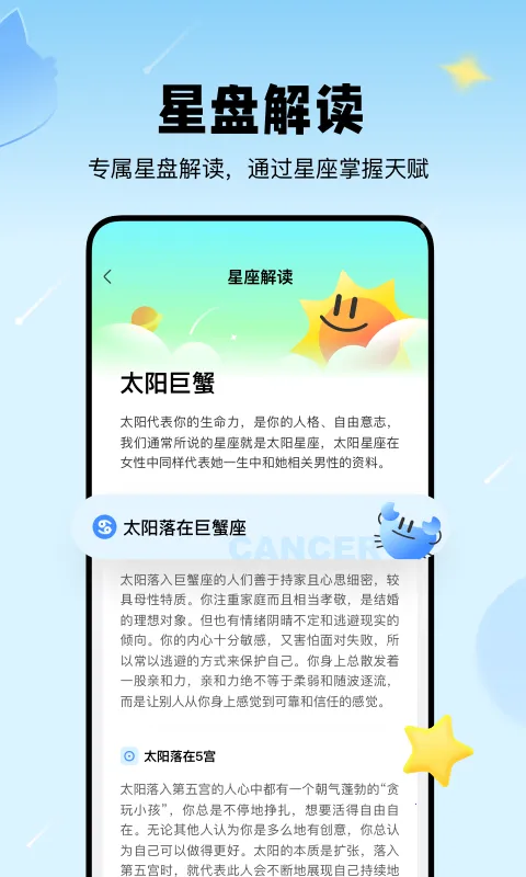 3. 能进行恋爱合盘测算,解密星盘,为情感关系提供建议,了解与他人相处模式。