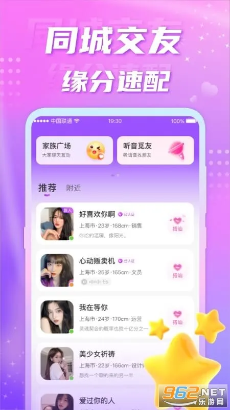 使用时,注册登录简单方便,手机号注册或微信快捷登录都行。消息功能能让你和好友随时联系,还能一键申请加入家族,参与家族活动。在设置里能调整各项设置,绑定微信更快捷登录和分享。它告别了单一文字交流,视频聊天即时互动,高效交友。同城定位让线上交流延伸至线下,浪漫约会不再错过,帮你轻松邂逅缘分,告别单身。