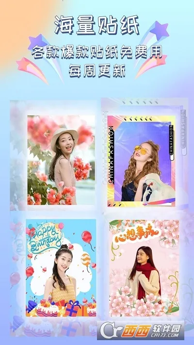 1. 海量贴纸免费更新:各款爆款贴纸免费用,每周都会更新,让你的照片充满新鲜感。