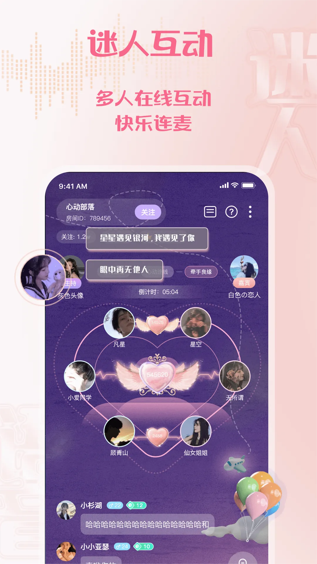 迷人语音是专注语音交友的社交软件,为单身用户打造自在空间。支持多种社交模式,有丰富语音互动玩法。能畅享聊天、分享动态,还可搜索全球用户、创建群组,官方认证更安心,下载注册简便。