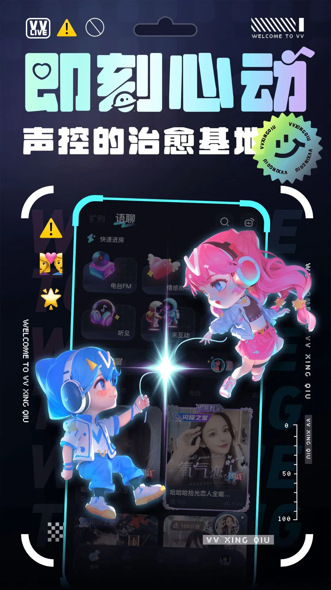 VV星球是一款超有趣的交友互动平台。不管白天黑夜,你都能随时加入一群人的狂欢派对,享受欢乐氛围。晚上失眠也不怕,这里有视频秀场能陪你到天亮。它支持视频互动和语音聊天,让交流更便捷。通过雷达匹配,能以声会友,喜欢就Pik对方。