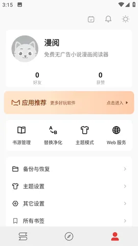 漫阅是资源丰富的小说阅读软件,分类清晰,提供一站式服务。有多样化功能窗口,操作简单实用,每天更新资源。还可导入海量书源漫画源,免费下载阅读,具备多源书库、个性化模式等特色及多种强大功能。