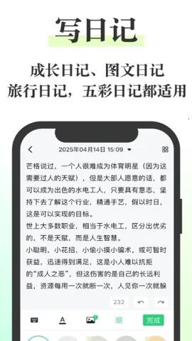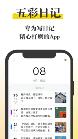 五彩日记APP超好用!它是一款强大的生活记录软件。能满足日常日记撰写、创意手账制作、个人事务备忘等需求,特别适合记录成长点滴和旅行见闻。有多样化的日记记录模式,可轻松书写保存生活。它的功能超丰富,写日记功能强大,能编辑生活日记,保存珍贵回忆;支持自定义日记样式,选择主题、设置字体;能上传图片记录,让生活画面更生动直观;日历回顾可在线回顾历史日记,勾起美好回忆;日历视图方便查询日记;还支持日记分享。软件优势明显,简单日记满足随时记录需求;多种记录方式清晰全面;多样主题和字体满足个性化;简约视图便于查看;个人日记可免费回顾还能设提醒。使用也很方便,下载打开就能编辑,过程中可随心选择主题字体,完成后能图文查看、设提醒、一键生成卡片分享。总之,是记录生活的好帮手,值得拥有!