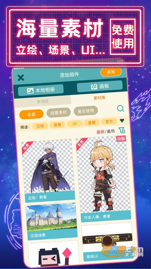 2、海量素材助力:内置角色、背景、音效等丰富素材,还有立绘、场景、UI 界面等素材可免费使用,甚至能从手机本地导入素材,提升创作效率与质量,减少开发者负担。