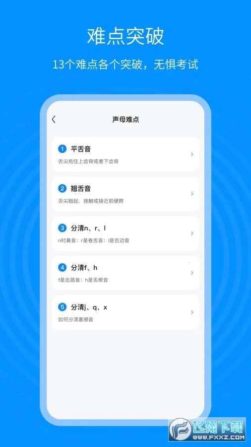 4. 专项练习提成绩:提供全面的声母韵母声调单音节字多音节词短文朗读等练习,针对薄弱环节进行针对性练习,让考试成绩更优。