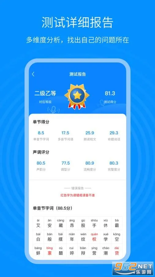 2. 专业发音评分:软件采用先进人工智能测评技术,对你的普通话发音进行评分,帮你找出错误发音,针对性纠正,有效提高普通话水平。