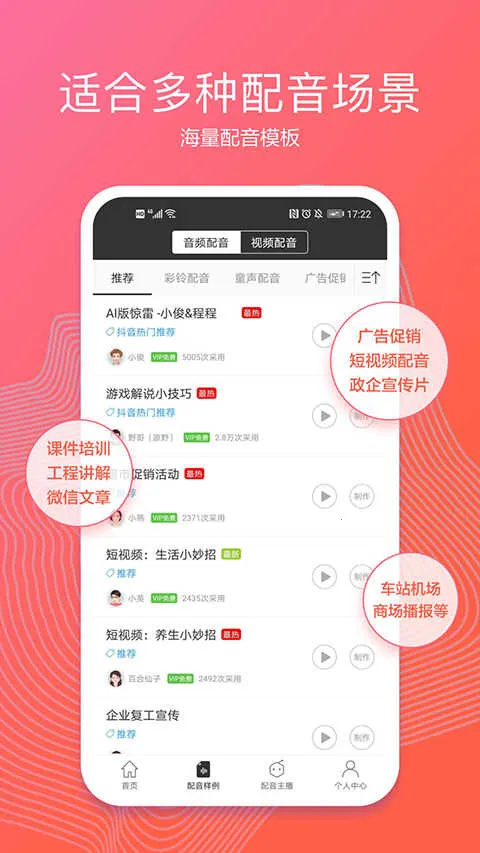 2. 配音服务全:搜罗全国知名真人主播,打造合成主播真人配音的一站式配音服务,不论何种需求都能满足。