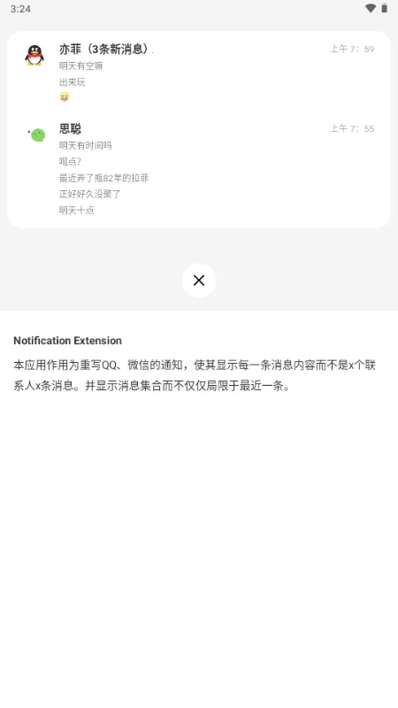 通知扩展app最新版使用方便,支持QQ、微信和TIM三大安卓客户端,需授予通知管理辅助服务和悬浮窗三大权限才可正常使用。它能重写QQ微信通知,显示每一条消息内容,设置相关策略后可防止应用后台切断。操作简单,使用灵活,还能支持手机隐藏通知栏的固定通知,支持深色模式和原色模式,可休眠系统通知栏中无法滑动消除的通知。感兴趣的朋友不妨下载体验,相信会给你带来不一样的感受,让你在使用手机过程中更加便捷高效。
