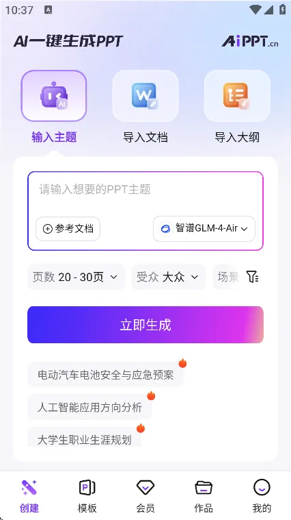 不管是商务演讲、工作汇报,还是课件制作,AIPPT手机版都适用。操作简单易上手,轻松就能制作出专业水准的PPT,真的很方便!