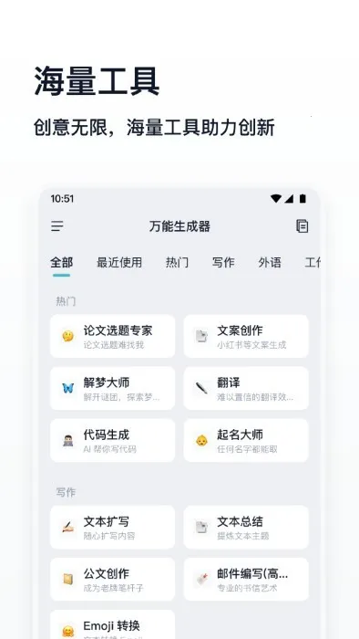 万能生成器软件超实用!它汇集了超多实用小功能,能解决不少实际需求。虽然不能直接生成各种图片视频,但在文案创作方面超厉害。它能进行文本文案创作、代码生成以及翻译等,功能全面还分类详细,方便快速查找。软件优势明显,文章和文件模板种类齐全,生成文章时输入关键字,自动生成合理语句,且生成过程能自由编辑添加。亮点也不少,自带强大翻译功能,生成文章可同步翻译,文章代码和参数能在个人中心设置,生成的文案还能在线快速预览。使用教程简单,先下载安装,按工具类型找所需工具,比如用文本扩写工具智能扩写文本,用翻译工具实时翻译多语言文本,还能查阅工具使用历史。用它能让你学习文章编辑及生成技巧,在工作和日常视频发布中都能帮大忙,赶紧下载体验吧!