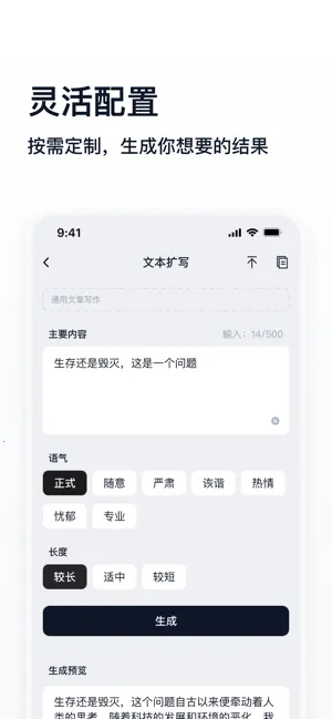 2. 文章及文件模板种类齐全,生成文章时能输入关键字,通过自动生成模式生成合理语句,生成过程还能自由编辑添加。