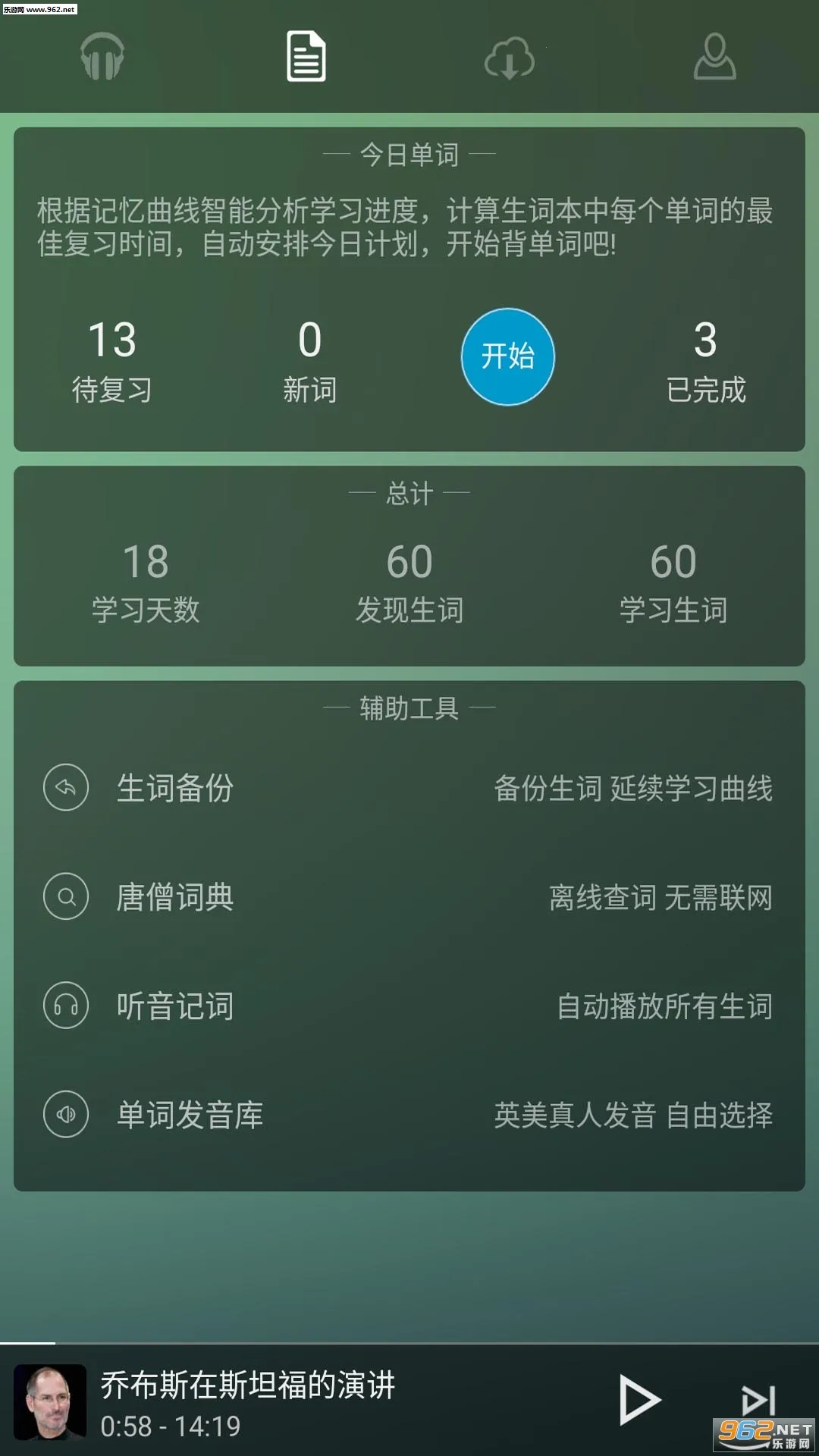 智能学习功能:支持同步中英文字幕,随意上下滑动,点击单词即时翻译;可将生词轻松记入生词本,按记忆曲线背单词;能轻松制定学习计划;还有单句多句循环播放功能,帮助提升语感和熟悉单词。