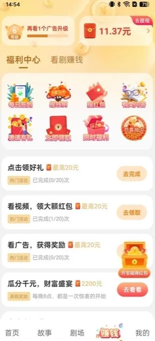 3. 领取方式多样:在福利中心有超多领取红包的方式,刷短剧、看广告等都能获取红包,还能和众多用户一起瓜分短剧红包。