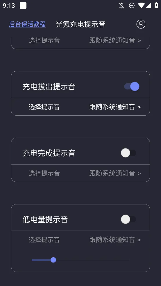 3. 保护电池寿命:插入充电以及拔出充电都可设置对应提示音,能提醒保护电池寿命,避免忘记拔电导致电池过度充电。