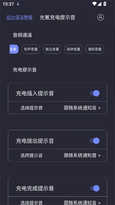 光氪充电提示音能让手机充电过程趣味十足。它支持自定义充电提示音等功能,可根据不同场景自由选择个性化提示音。有许多热门提示音资源供挑选,能设置专属个性充电秀。各种音频提示语应有尽有且免费下载使用,还能自定义编辑并分享。适用各种机型,功能多样。比如插入充电以及拔出充电都能设置对应提示音,每次充电听到喜欢的提示音,从此爱上充电,避免忘记拔电损伤电池,增添使用手机的趣味性。