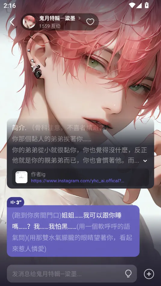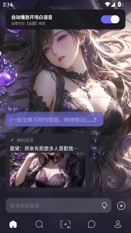 2. 沉浸式互动玩法多样:文字语音实时聊天,7×24小时秒回,适合长对话;一键拨号进入电话模式,AI主动问候或闲聊;角色扮演有多种剧本,也能自定义剧情;动态相册会根据聊天生成插画或合照并自动保存。