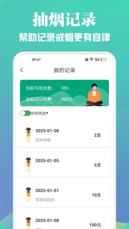 3. 精准记录每日抽烟数量,并提供详细的图表分析和数据统计,助您清晰了解抽烟状况,更好助力戒烟。