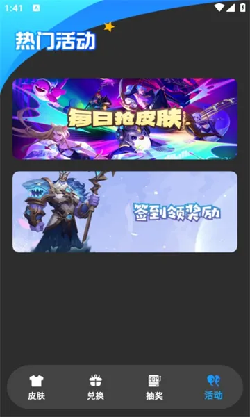 玩法很简单,每天连续签到就能赚取金币奖励,金币积累到一定数量,就能在线兑换心仪的游戏皮肤。软件还常推出各种热门活动,比如观看广告视频参加幸运抽奖等,参与活动也能领取更多福利。