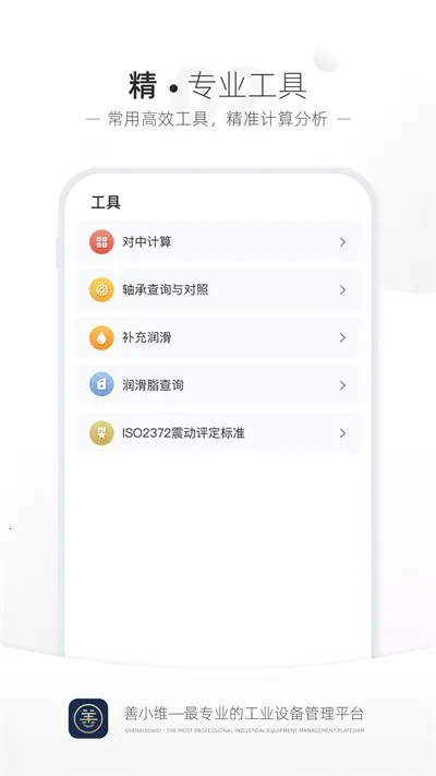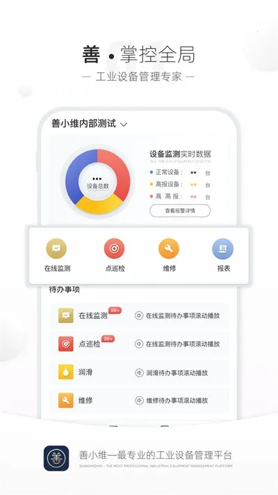 善小维2025最新版本是一款AES设备管理软件,可随时了解设备运行状态,实现数据管理。故障及时报警,方便维修。具备设备状态监测、点巡检、维修保养等功能,还有多项实用工具,与PC端同步,让工业维保更轻松。
