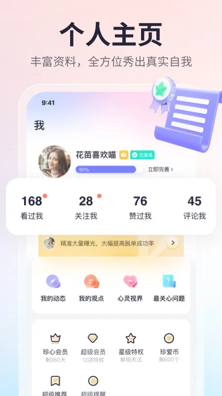 1. 海量优质单身用户,汇聚于此。实名认证,真实可靠,资料丰富立体。
