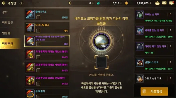 4、铁匠铺 最后可以进行 的声望增幅内容是 “附魔” 。您可以通过结界来增加声望能力,该结界可以通过合成各种怪物或地牢卡片来获得各种统计数据,这些怪物可以在地下城周围的过程中随机获得,但不像徽章那样会在拆除设备时返回。用来附魔的就不要回来了,把一开始用过的传下来的装备附魔感觉有点浪费。建议尽量保留稀有卡牌,以普通卡和非普通卡为重点进行附魔。