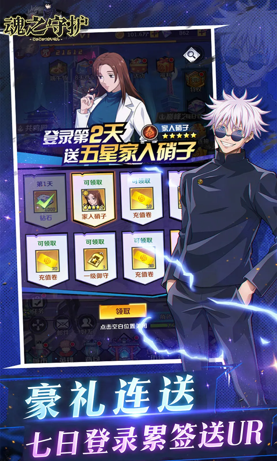 2. 福利丰厚,签到即送充值券和核心UR卡牌五条悟涩谷,日常活跃送千元代金券,折扣版提供0.1折充值特惠,每日登录还有100次抽卡机会。