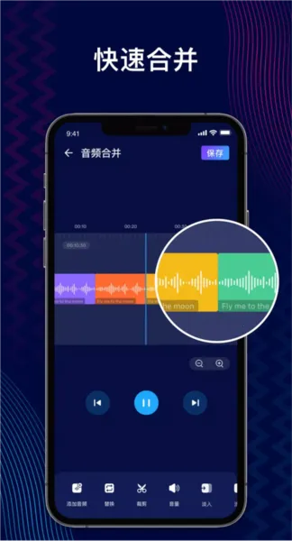 2、功能专业强大:支持音乐剪辑、合并、混音等高级功能,还能实现音频变速、升调、降调、增益、噪声消除、变音等效果,内置多种场景音效,满足多样音频处理需求。