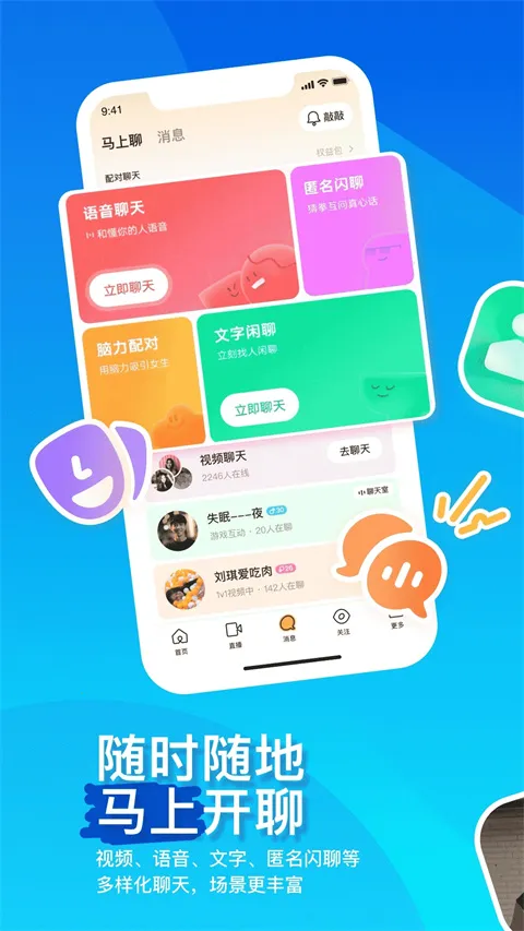 平台功能超丰富,有附近的人动态,可浏览身边趣事;附近直播,能与高颜值主播互动;还有小宇宙、马上聊、匿名闪聊等多种聊天方式,以及互动小游戏。支持文字、语音、视频等沟通,交流真实生动。能免费发送短信、语音、照片及位置,即时了解信息送达状态。可设置隐身、静音时段,拉黑讨厌的人,保障隐私。跨安卓和苹果平台,各类网络都能用。操作简单易上手,能让你轻松享受畅快交友体验,满足你对真实社交的期待,快来试试吧!