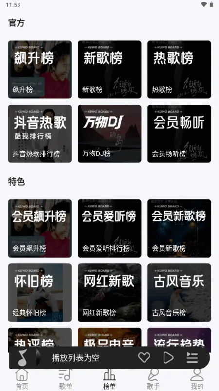 3. 支持按歌手、专辑或榜单浏览音乐资源,还可根据个人喜好创建和管理你自己的歌单。