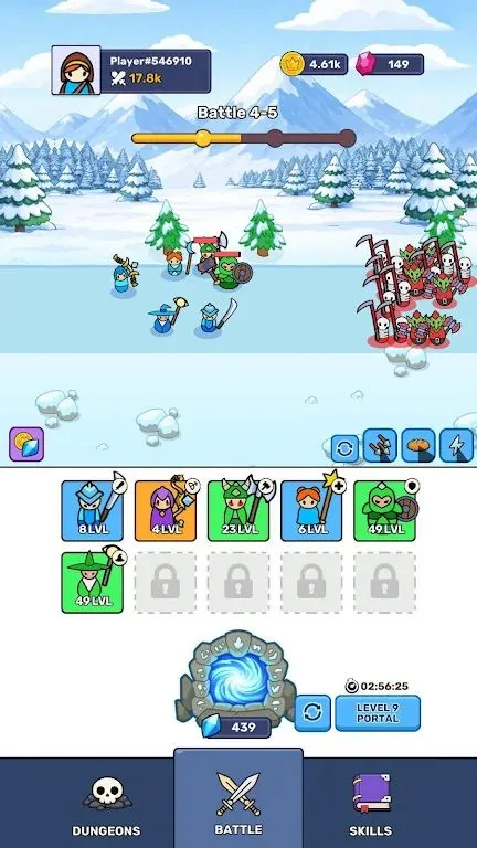 这是一款充满魅力的放置类战斗游戏。在世界尽头,古老传送门伫立,召唤门后之物开启战斗之旅。你能召唤剑士、弓箭手、坦克、法师等各具特色的单位,每个都有独特稀有度和潜力。通过替换弱者、进化军队、优化阵型来登上巅峰。不仅要突破一波波敌人和首领,更要精心抉择战士的命运。除主线剧情,还有隐藏地下城。各职业有独特被动技能树,可打造专属战略。轻触传送门召唤,升华军队,征战无尽战火,向着力量之巅进发,体验非凡战斗乐趣。