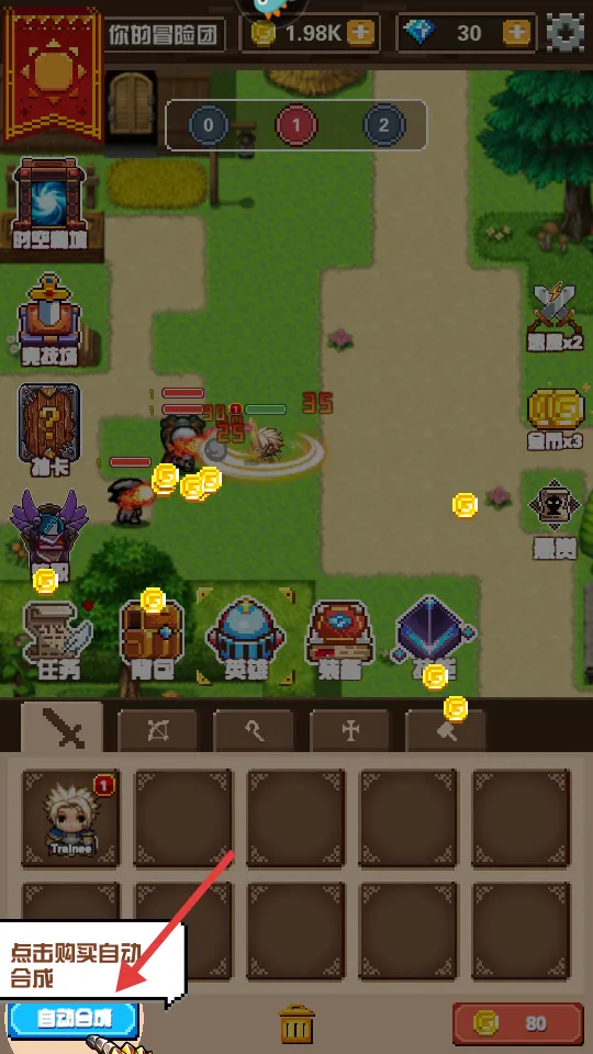 1、手动召集伙伴并肩作战或轻松挂机刷怪获取金币装备。