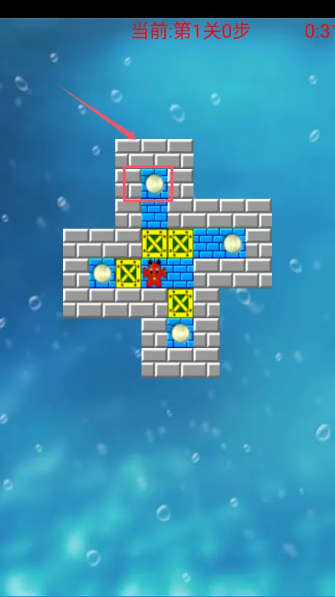 1、开启第1关后,需先理清场地的整体结构。操作角色被黄色障碍块环绕,蓝色通路串联着多个白色目标球。第一步是操控角色向左移动靠近黄色障碍块,利用这个位置进行站位调整。