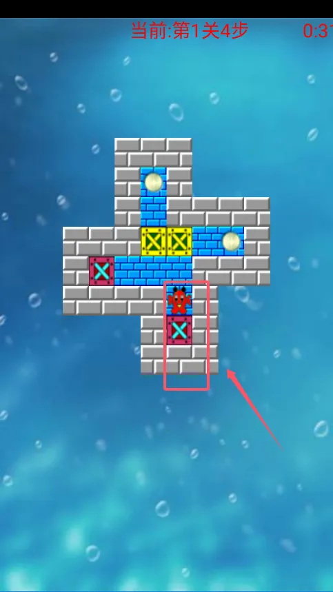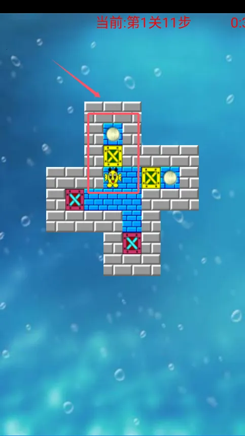 3、接着变换角色的站立方向,从下方将黄色障碍块向上推动。这一步是为了逐步打通抵达上方白色球体的通路,操作中需协调好各个障碍块的摆放位置。