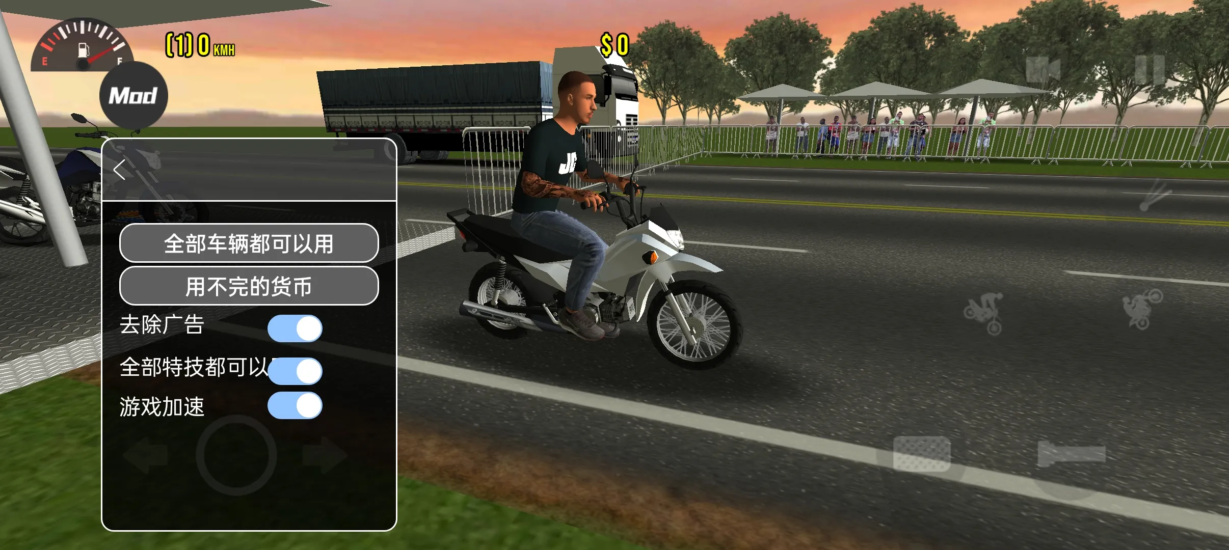 1. 虚拟按键布局科学:左右分工明确,左侧控制方向与平衡微调,右侧负责加速刹车与特技触发。触控零延迟,支持灵敏度自定义,新手易上手,老手能追求极致微操。
