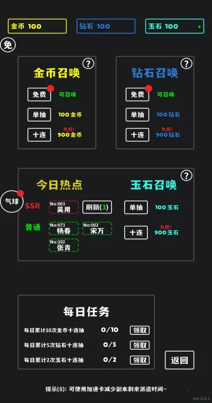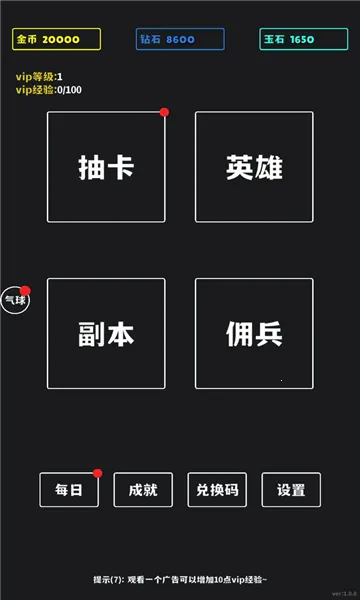 它的十连抽玩法很有特色,抽卡概率较高,还有限定抽卡机会解锁特殊关卡。操作简单易懂,极易上手,主打不氪不肝的休闲体验模式,随时能利用碎片时间玩。副本派遣也有攻略,每个副本有优先派遣武将,派遣相应武将可得钻石,万能武将能补位。玩法技巧方面,vip每日奖励和快速挂机6点刷新,vip经验看广告获得,佣兵里的天罡90分钟、地煞30分钟后看广告双倍,2小时副本和10小时副本平均收益一样,气球5分30秒出现一次奖励资源,看完广告消失。总之,这游戏能让你轻松享受集卡和战斗的快乐,快来试试吧!
